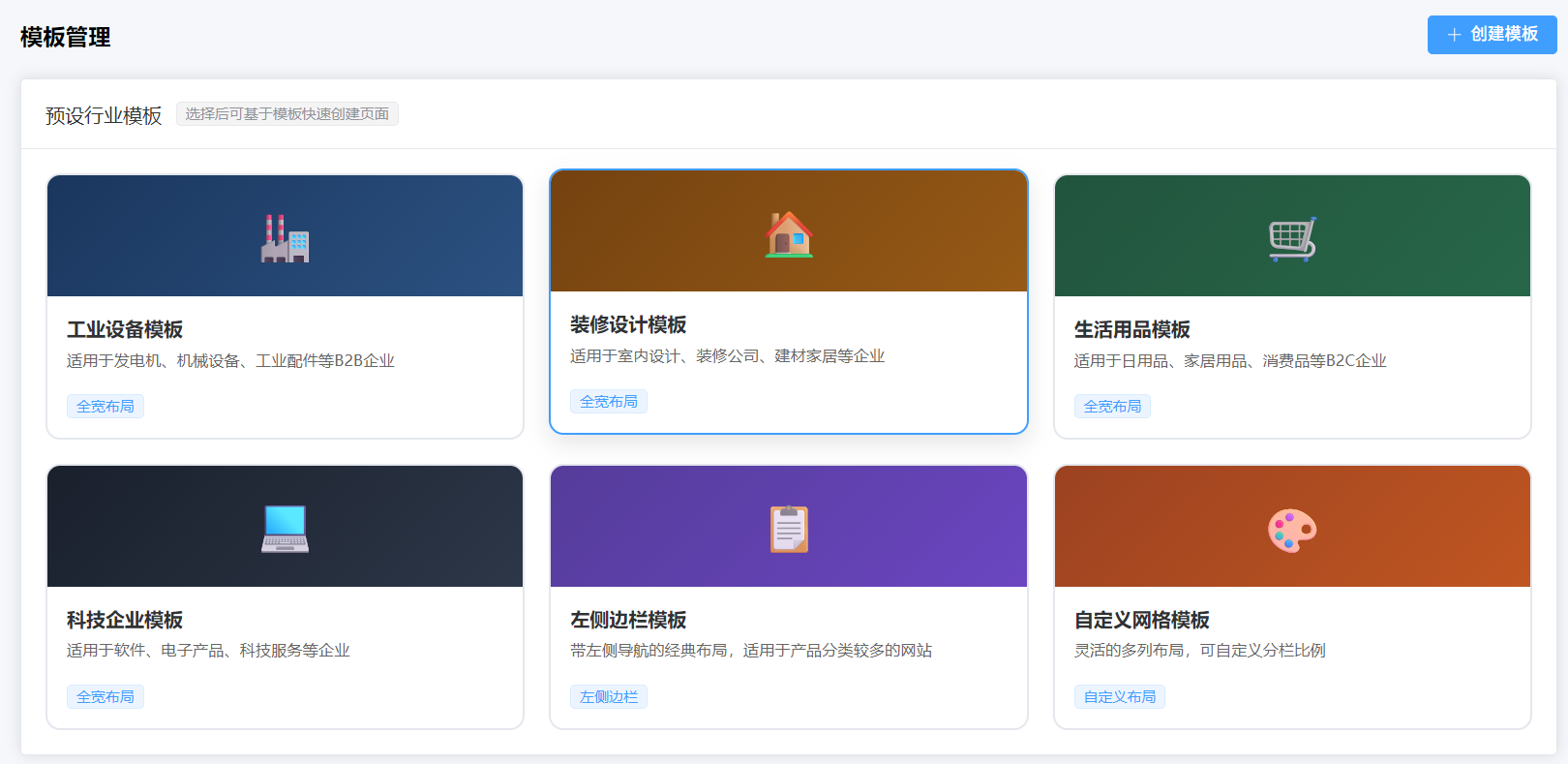 - **模板管理**:预设行业模板,支持多种布局方式